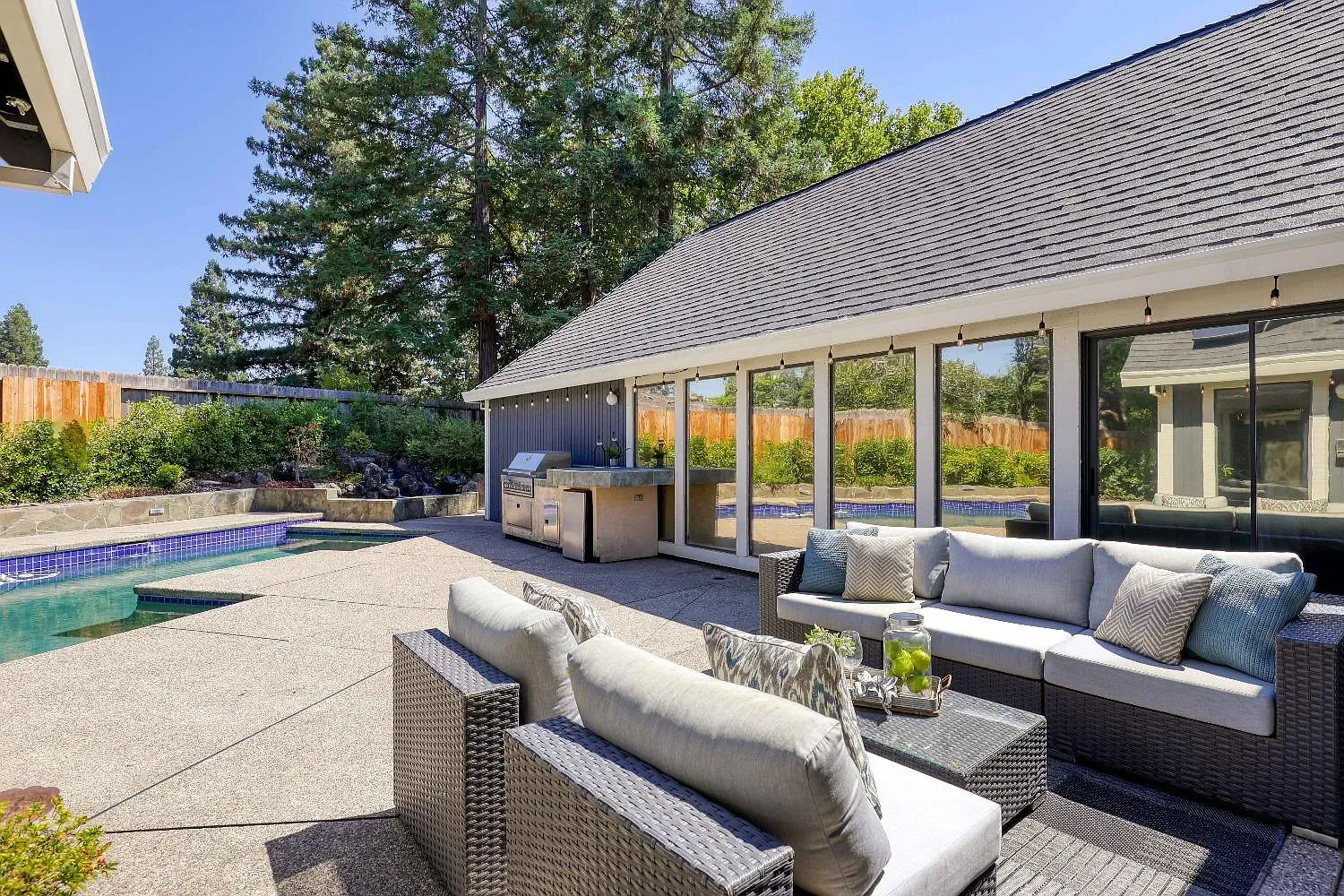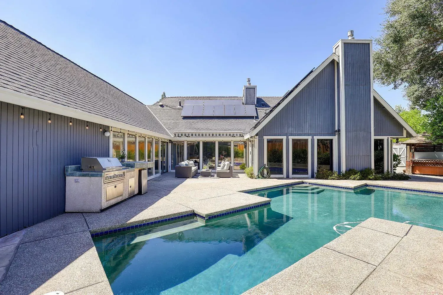 The property sits on a spacious quarter-acre lot that includes a pool and hot tub with a gazebo, great for relaxation and enjoyment during the warmer months, a built-in BBQ area with a fridge perfect for hosting outdoor gatherings and barbecues, and two storage sheds.